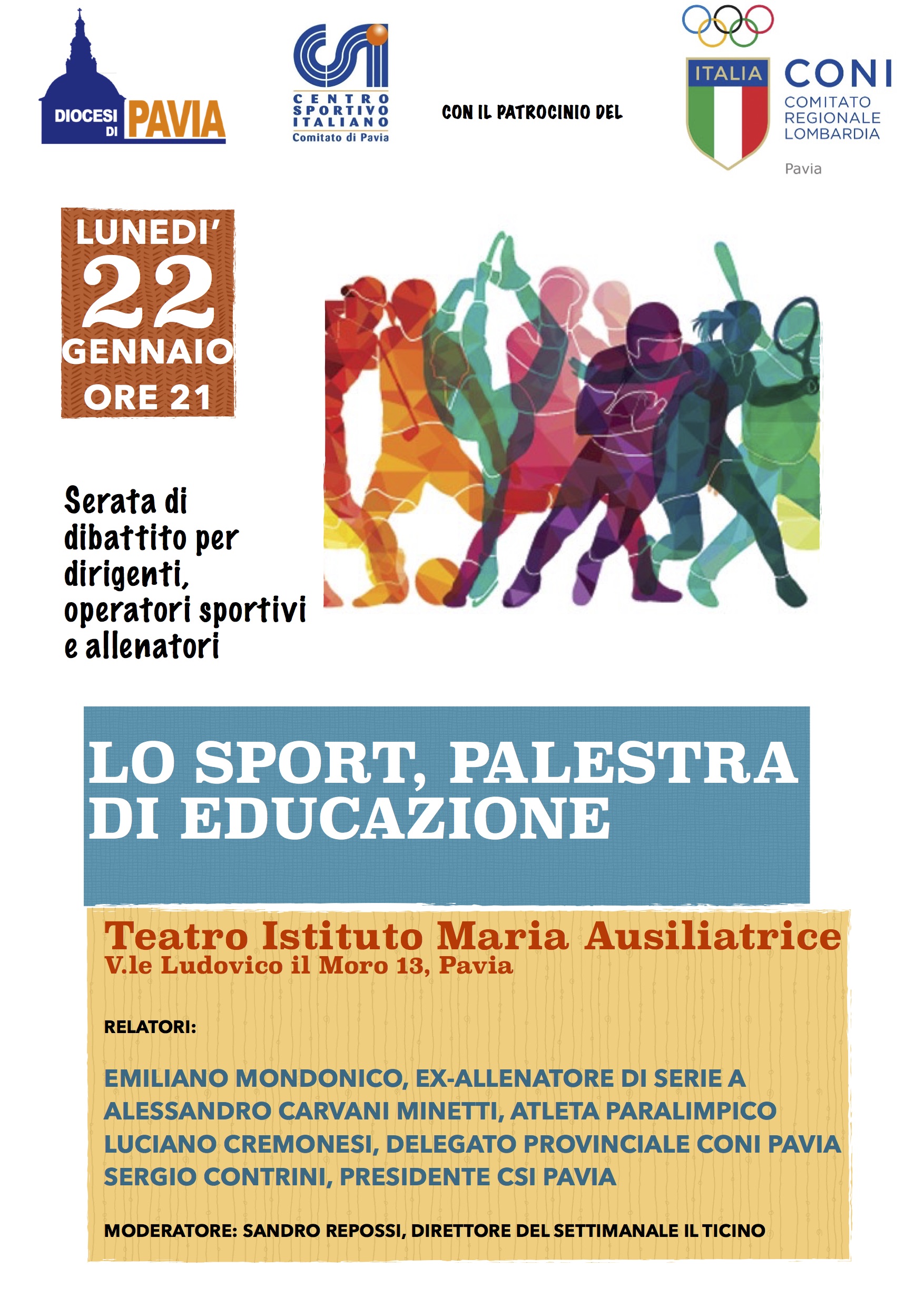 Lunedì 22 Gennaio alle ore 21 presso l’Istituto Maria Ausiliatrice il dibattito con Emiliano Mondonico, Alessandro Carvani Minetti, Luciano Cremonesi, Sergio Contrini e Sandro Repossi in occasione della settimana dell’educazione e del Sinodo dei Giovani. Per dirigenti e allenatori sportivi. Tutte le info nella locandina e nella lettera di presentazione.