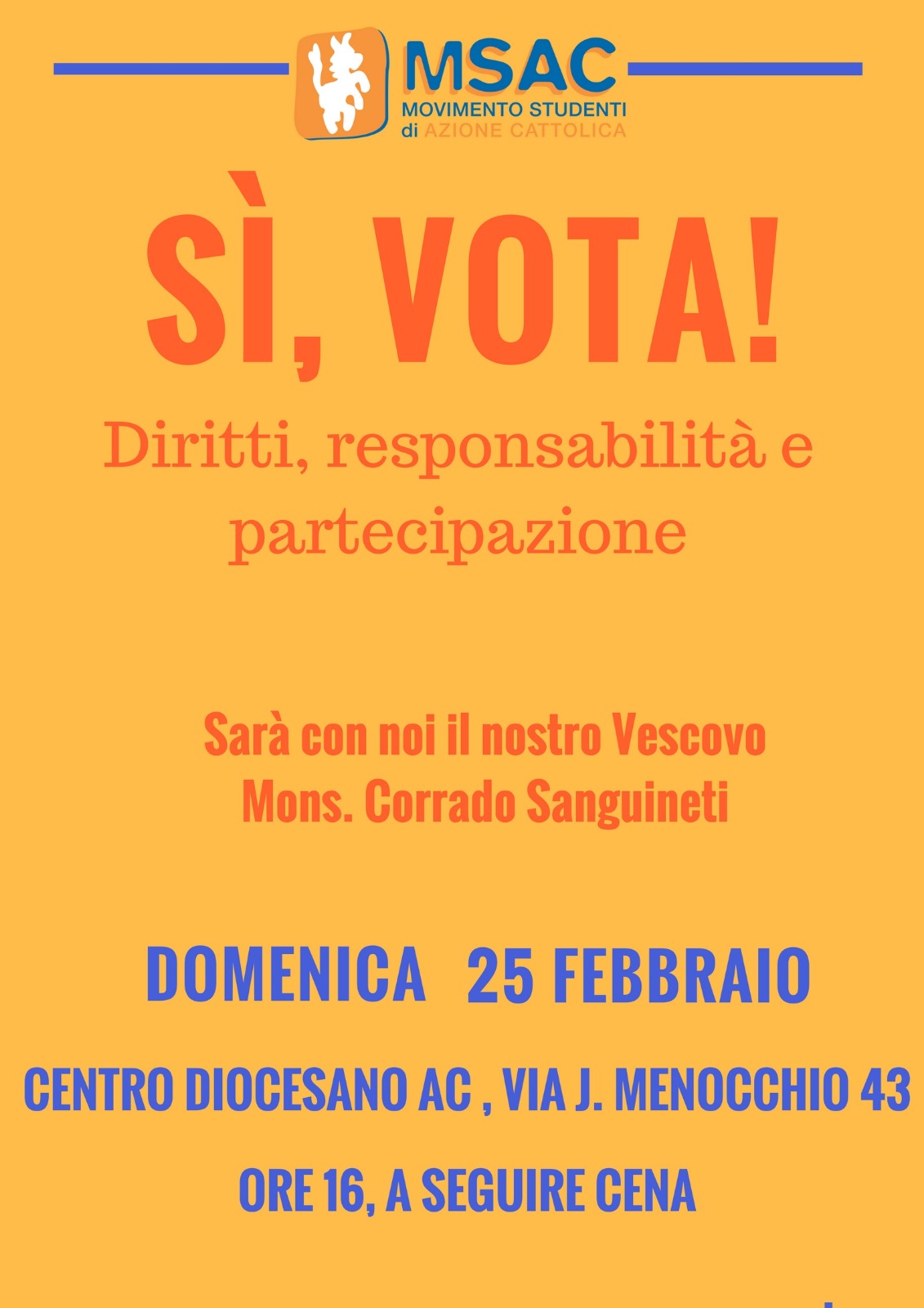 MSAC (Movimento studenti di Azione Cattolica) propone per domenica 25 febbraio una giornata di studio sul tema “Sì, vota! Diritti, responsabilità e partecipazione” alle ore 16 presso la sede di via Menocchio 43. Gli studenti sono calorosamente invitati.
