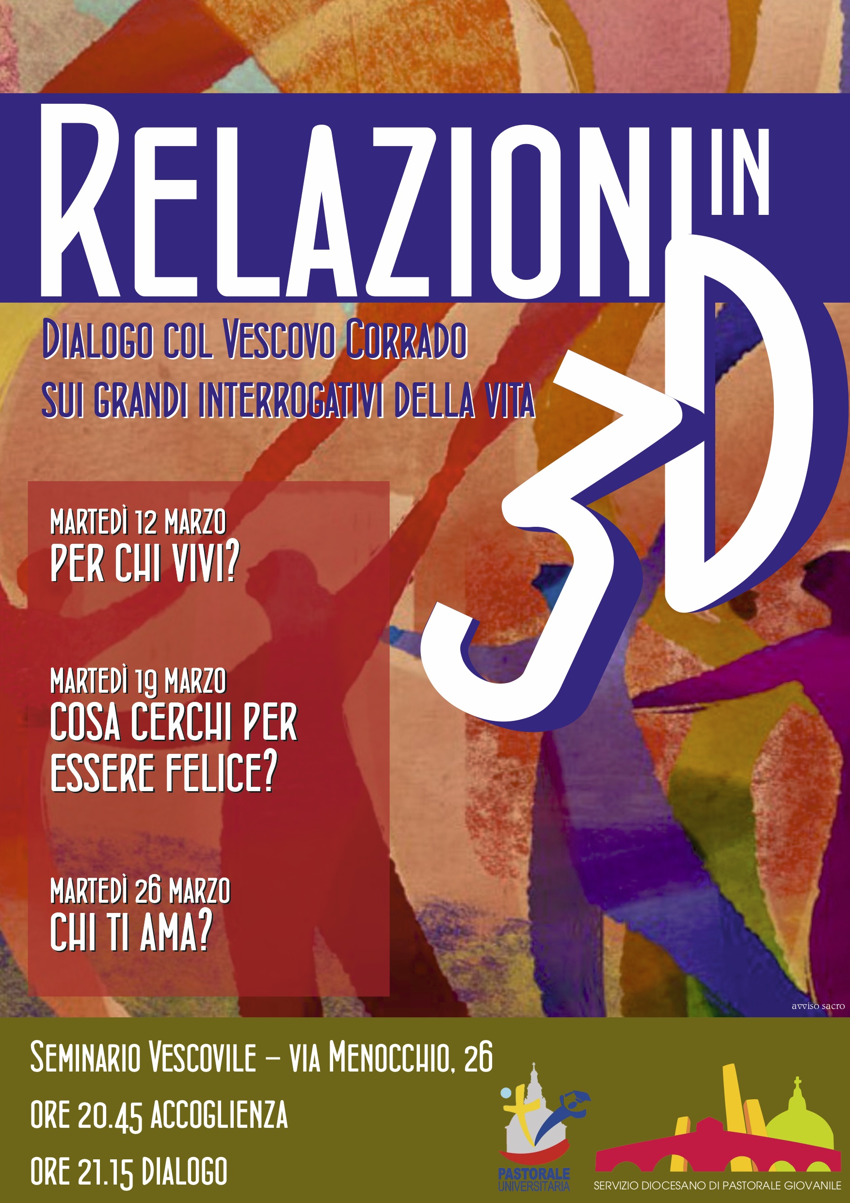 Un itinerario, dal tema: “RELAZIONI in 3D” che vivremo nei martedì 12 – 19 – 26 marzo alle ore 20.45 Accoglienza – ore 21.15 Catechesi – Dialogo presso il seminario Vescovile in via Menocchio 26 in Pavia e si concluderà con la VEGLIA delle Palme SABATO 13 APRILE 2019 alle ore 21 in Cattedrale.