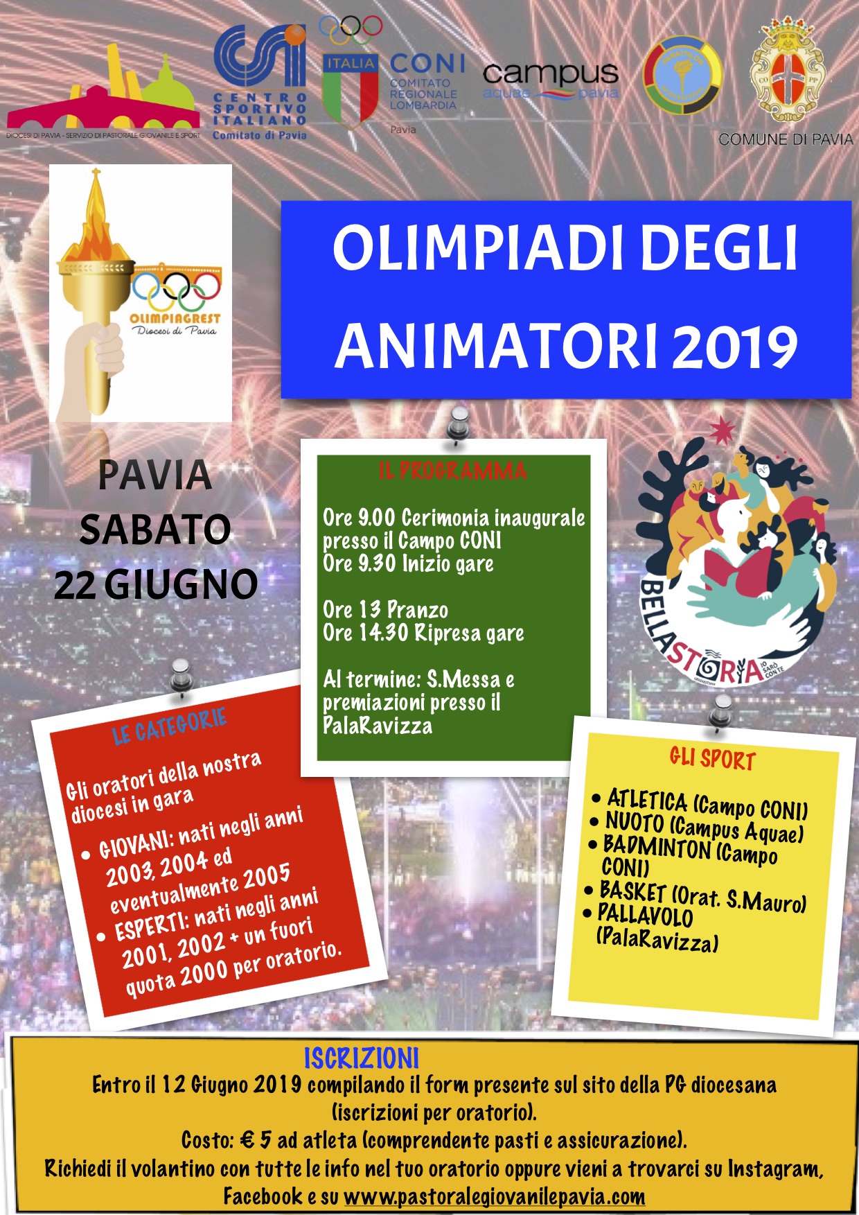 Anche quest’anno Pastorale Giovanile e Pastorale dello Sport, in collaborazione con CSI, Panathlon, Campus Aquae, CONI e Comune di Pavia, organizzano le Olimpiadi degli animatori, in programma SABATO 22 GIUGNO 2019 con il seguente programma: