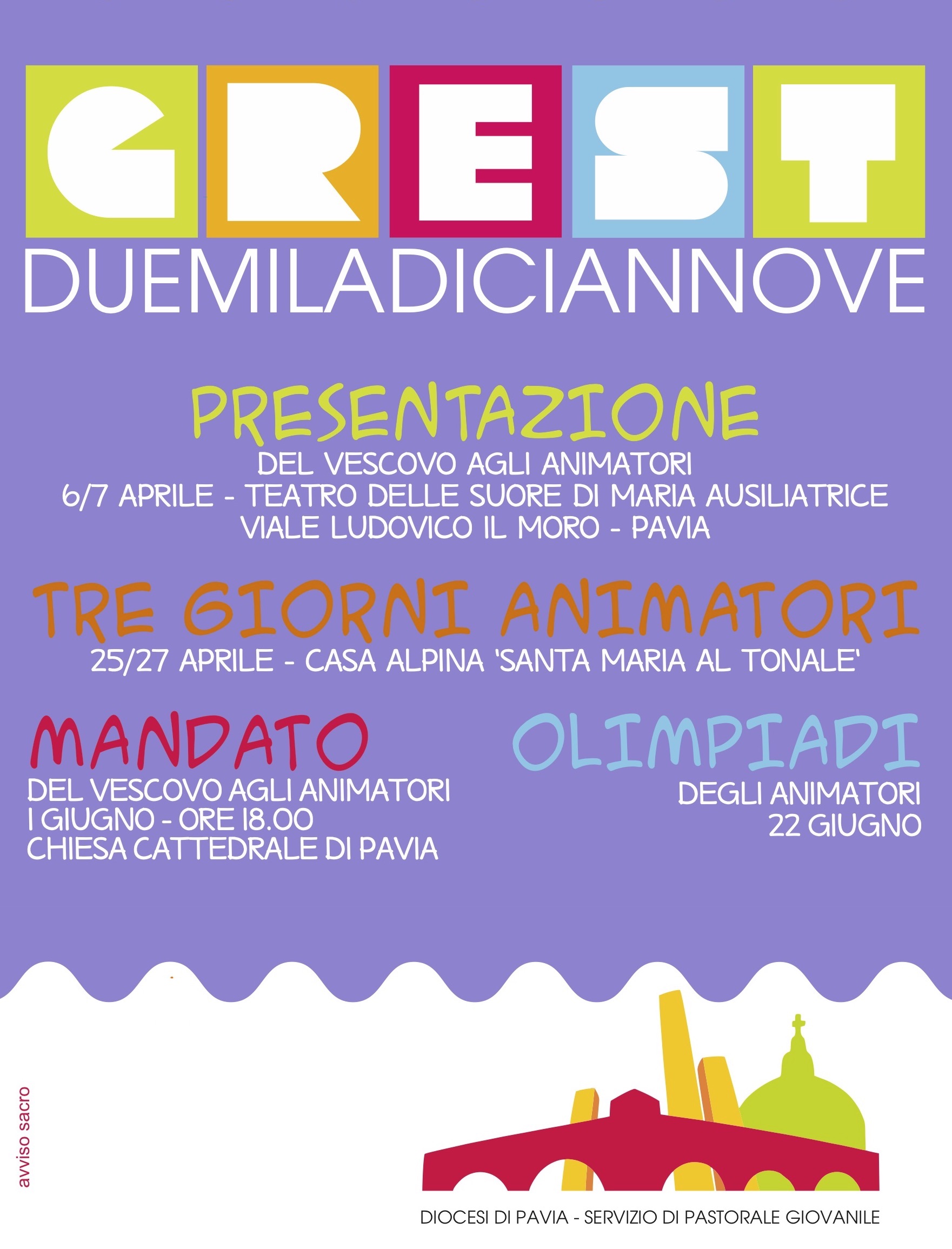 Mandato agli animatori 27Mag 20196 Giu 2019Aggiungi un commento SABATO 1 GIUGNO in Cattedrale è in programma il Mandato del Vescovo agli animatori dei nostri grest. Ecco il programma: Ore 17.45 ritrovo in piazza Ore 18 Preghiera in Cattedrale e mandato del Vescovo Ore 18.45 conclusione Condividi:Condivisione Condividi su Facebook (Si apre in una nuova finestra) Facebook Condividi su X (Si apre in una nuova finestra) X Mi piace Caricamento...