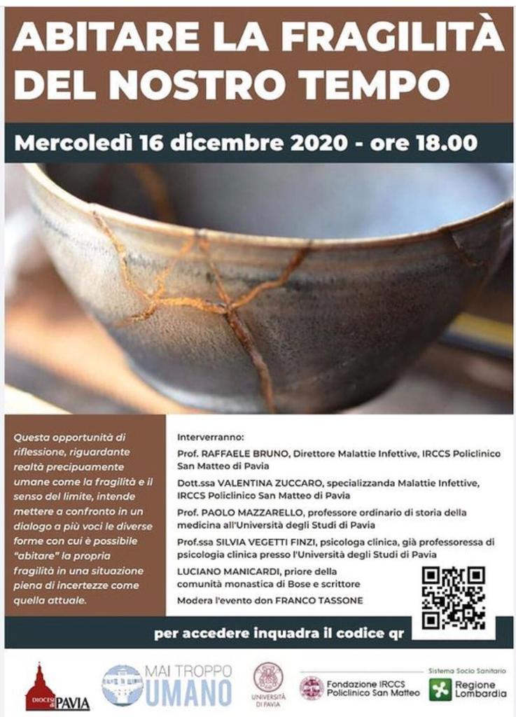 Il Comitato Mai troppo umano ha organizzato, in data mercoledì 16 dicembre 2020 alle ore 18.00 un incontro in modalità webinar incentrato sul tema “Abitare la fragilità nel nostro tempo. Questa opportunità di riflessione, riguardante realtà precipuamente umane come la fragilità e il senso del limite, intende mettere a confronto in un dialogo a più voci le diverse forme con cui è possibile “abitare” la propria fragilità in una situazione piena di incertezze come quella attuale. Durante l’incontro interverranno:Prof. Raffele Bruno, Direttore Malattie Infettive 1, IRCCS Policlinico San Matteo di Pavia.Dott.ssa Valentina Zuccaro, specializzanda Malattie Infettive.Prof. Paolo Mazzarello, professore ordinario di Storia della medicina all’Università degli Studi di Pavia.Prof.ssa Silvia Vegetti Finzi, psicologa clinica, già professoressa di psicologia clinica presso l’Università degli Studi di Pavia.Luciano Manicardi, priore della comunità monastica di Bose e scrittore.Il collegamento alla conferenza sarà effettuato tramite il seguente canale: https://youtu.be/opVeuTLhypQ