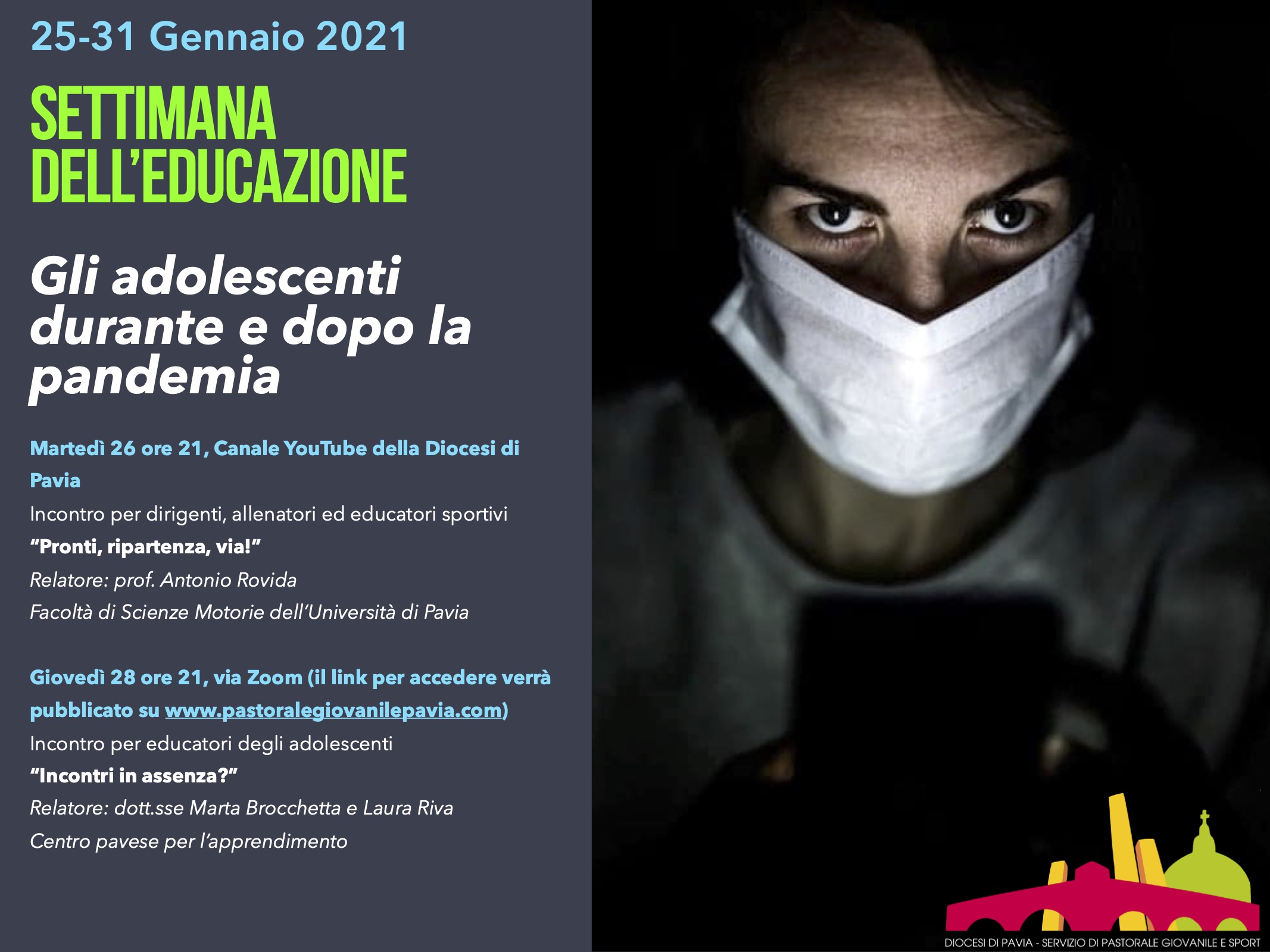 - Giovedì 28 Gennaio ore 21, incontro su Zoom per educatori degli adolescenti: Incontri in assenza? Relatore: dott.sse Marta Brocchetta e Laura Riva, Centro pavese per l’apprendimento: