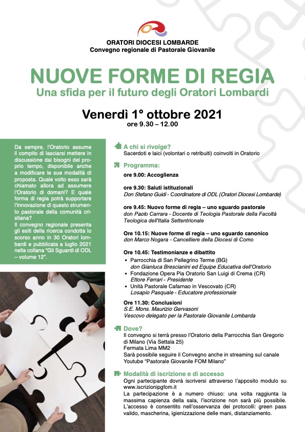 Quali modalità possiamo mettere in campo per incontrare realmente i destinatari e i contesti sociali per e dentro i quali l’Oratorio opera? Quale “governo” per ancora ben supportare questo “servizio” che la Chiesa fa e continuerà a fare a tutta la comunità, cristiana e non? A quale “modello di Chiesa” ispirarsi se occorre coinvolgere le dinamiche familiari dentro un progetto educativo fatto di alleanze? Queste sono solo alcune delle questioni che da tempo sono sul piatto di chi ha a che fare con l’Oratorio e la ricerca “Nuove forme di regia” esplora diversi scenari possibili in vista del futuro. Venerdì 1° ottobre, presso l’Oratorio della Parrocchia San Gregorio di Milano, si terrà il convegno di presentazione del dodicesimo volume de “Gli sguardi di ODL” con diversi interventi di approfondimento e testimonianze legate ai vissuti degli oratori.
