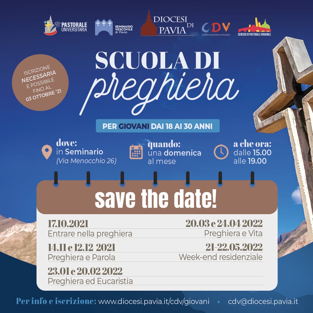 Sono aperte le iscrizioni alla “Scuola di preghiera” che il Centro Diocesano Vocazioni (CDV), in collaborazione con i Servizi diocesani di Pastorale giovanile e di Pastorale universitaria, proporrà per i giovani della nostra Diocesi. Si tratta di un percorso annuale che si avvierà il 17 ottobre prossimo e che sarà vissuto in Seminario una domenica pomeriggio al mese, secondo il calendario riportato nella locandina.