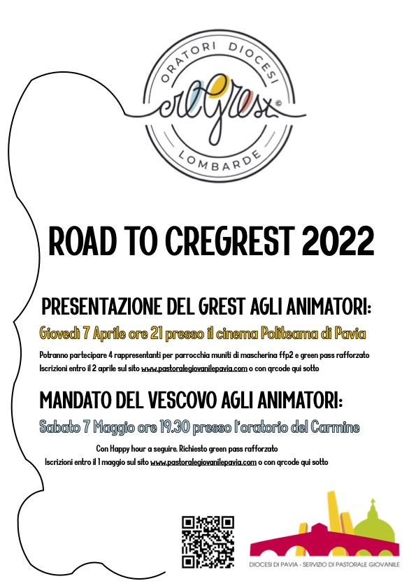 Road to cregrest 2022 3Mar 202230 Apr 2022 MANDATO ANIMATORI: SABATO 7 MAGGIO ORE 19.30 – CHIESA DEL CARMINE ISCRIZIONI PER IL MANDATO AGLI ANIMATORI DEL 7 MAGGIO road-to-cregrest-2022-pdfDownload Condividi:Condivisione Condividi su Facebook (Si apre in una nuova finestra) Facebook Condividi su X (Si apre in una nuova finestra) X Mi piace Caricamento...