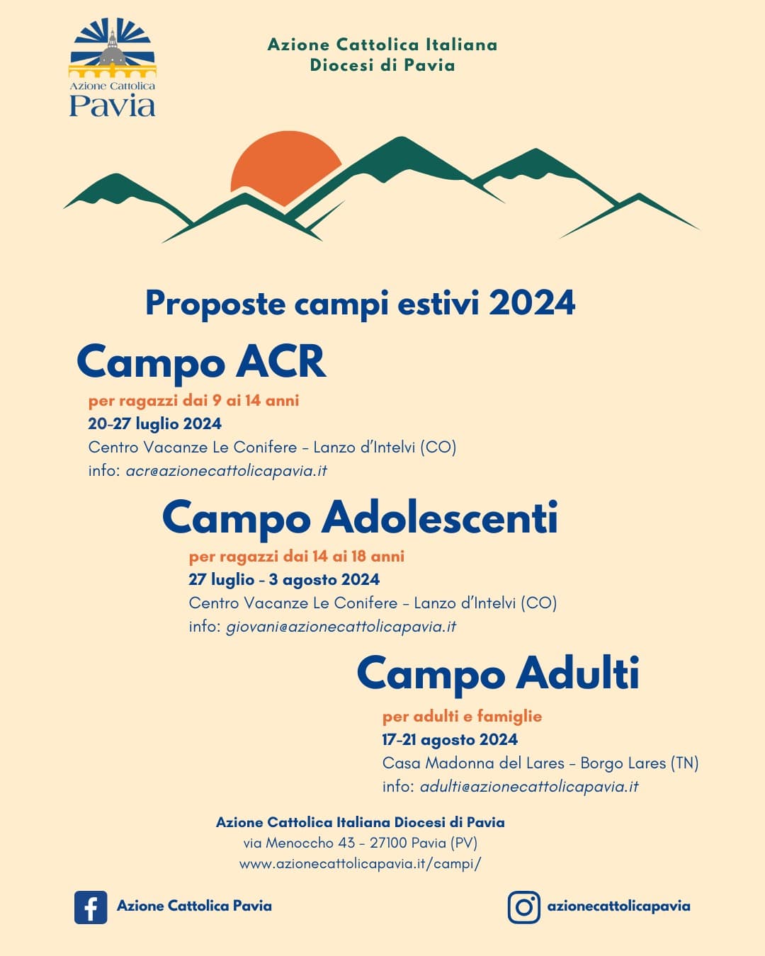 Infatti, i Campi AC per i ragazzi e per gli adulti non sono soltanto una bella vacanza (e certamente sarebbero una bella esperienza anche soltanto così): sono giornate ricche di momenti di gioco e di amicizia, di passeggiate e di incontri, ma anche di formazione e di preghiera. Sono giorni (e notti) che si portano nel cuore e che fanno crescere insieme nella fede e nella vita. Sono l’occasione per conoscere ragazzi (e adulti) di altre Parrocchie, per allargare lo sguardo e costruire relazioni belle e durature.
