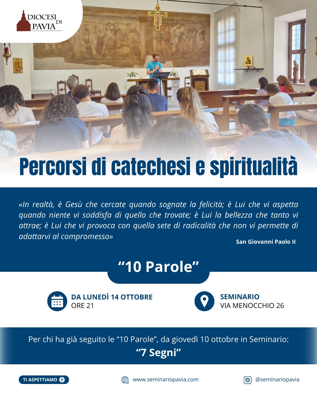 Percorsi di catechesi e spiritualità per giovani 2Ott 2024 Riprende il percorso per i giovani del lunedì sera “10 parole” da lunedì 14 ottobre in Seminario. Per chi ha già seguito il percorso negli scorsi anni inizierà il giovedì, a partire dal 10 ottobre, il percorso “7 segni”. LocandinaDownload Condividi:Condivisione Fai clic per condividere su Facebook (Si apre in una nuova finestra) Facebook Fai clic per condividere su X (Si apre in una nuova finestra) X Mi piace Caricamento...