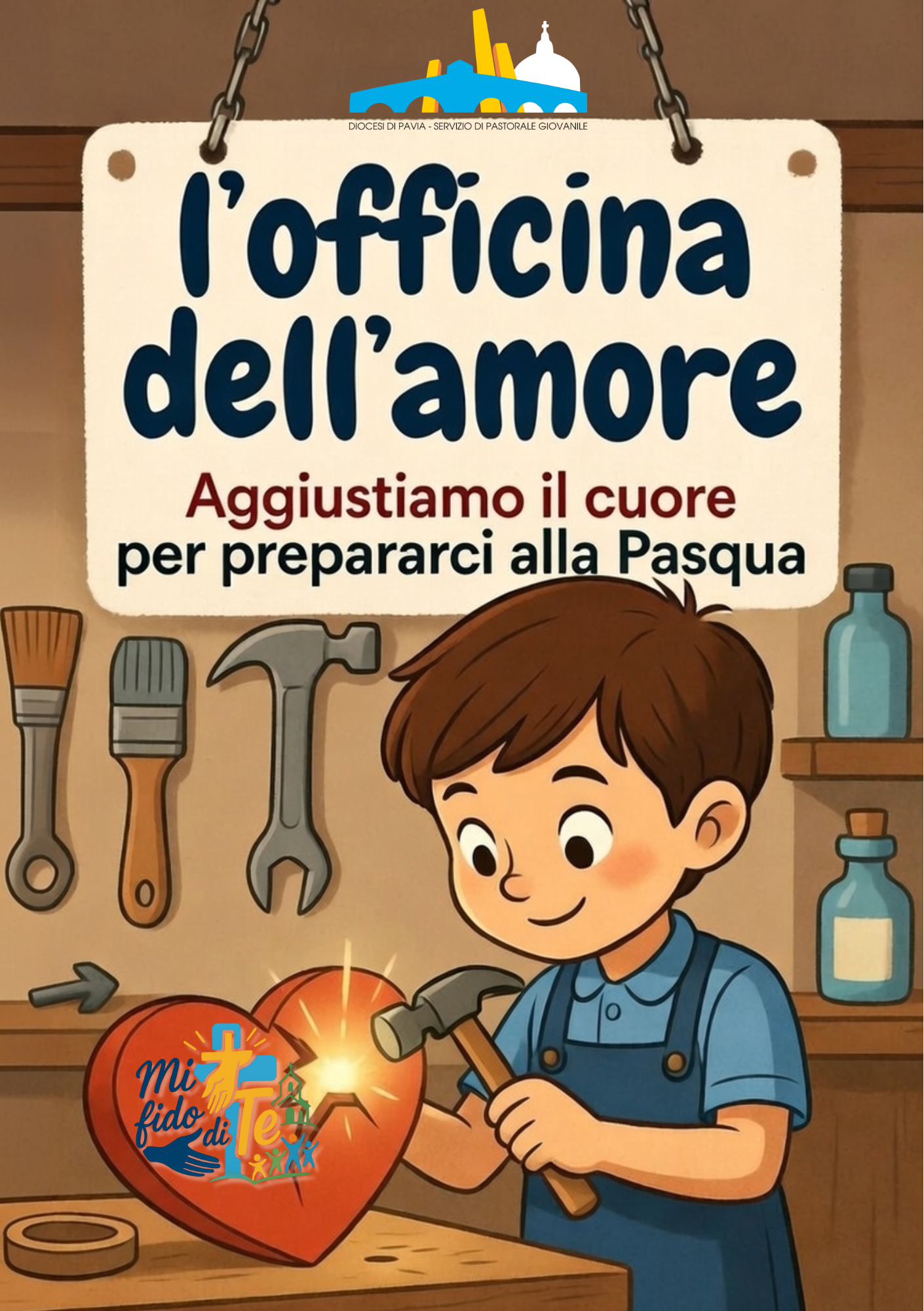 Il percorso della Quaresima 2026 avrà come titolo “L’officina dell’amore. Aggiustiamo il cuore per prepararlo alla Pasqua”. Obiettivo del percorso è aiutare i bambini a scoprire che la Quaresima è un tempo speciale in cui Gesù ci invita a prenderci cura del cuore, come in un’officina: si osserva, si pulisce, si ripara e si migliora con piccoli gesti di amore concreto. Immagine guida è quella della cassetta degli attrezzi che servono per aggiustare il cuore e correggere gli atteggiamenti sbagliati delle nostre giornate. Per i bambini verrà proposto un sussidio, a forma di libretto, con vangelo della domenica, preghiera, impegno (atteggiamento da aggiustare), piccola attività. Il costo è di 1,50 cad. da prenotare in curia (ufficio pastorale) o via mail a pastoralegiovanile@diocesi.pavia.it entro il 31/1/2026. I sussidi si potranno ritirare a partire dal 9 febbraio. Qui di seguito è possibile visionare la demo della prima settimana (ancora senza grafica definitiva). Per gli adolescenti e i giovani saranno prodotti dei podcast settimanali che potrete trovare sui canali Youtube e su Spotify della Pastorale Giovanile.
