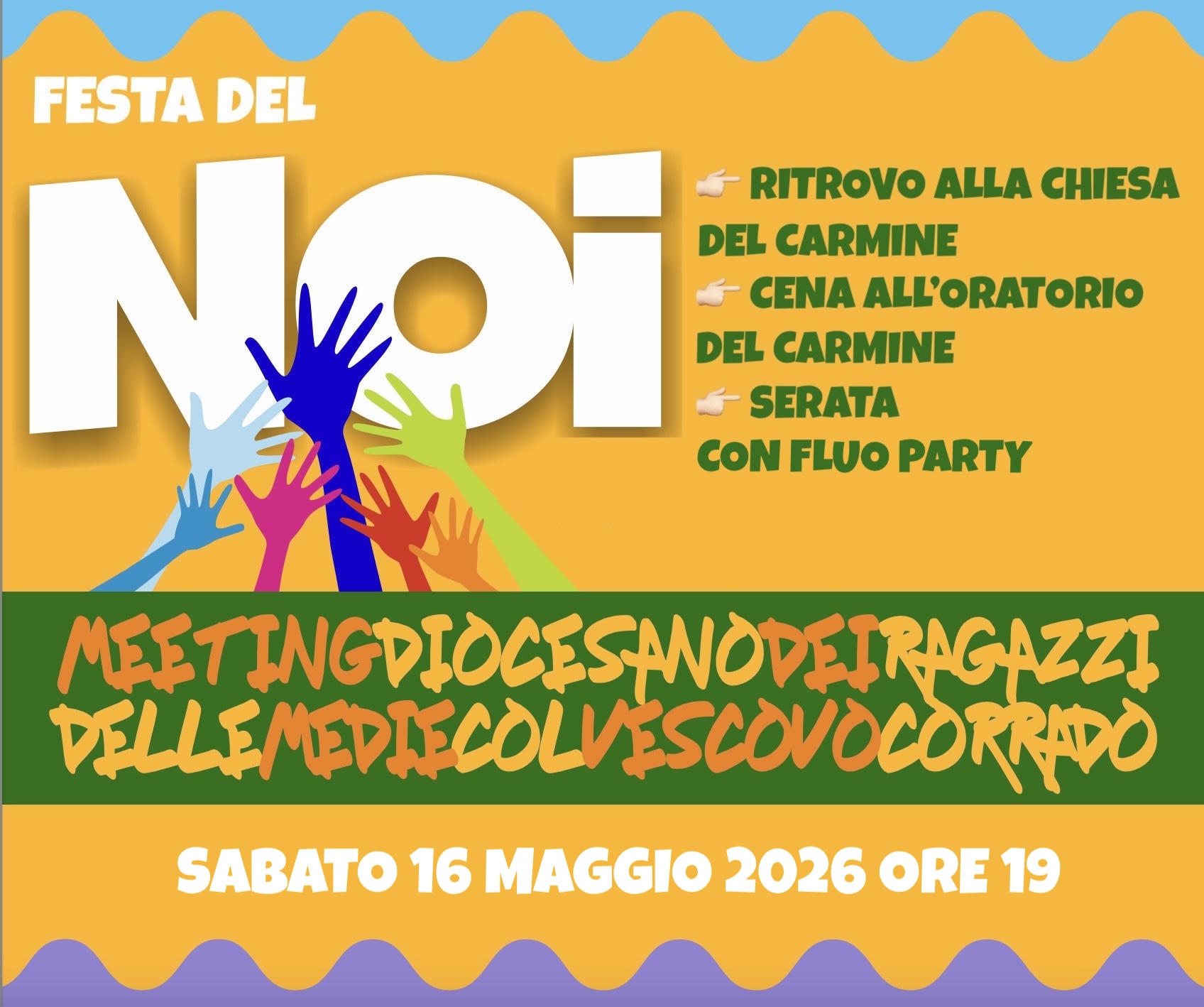 Sabato 16 Maggio alle ore 19 presso la Chiesa del Carmine a Pavia si terrà la FESTA DEL NOI, l’incontro dei ragazzi del postcresima con il Vescovo Corrado. Dopo la celebrazione in Cattedrale ci sposteremo presso l’Oratorio del Carmine per la cena e per la serata con animazione musicale insieme. Termine della serata ore 22.30 circa.